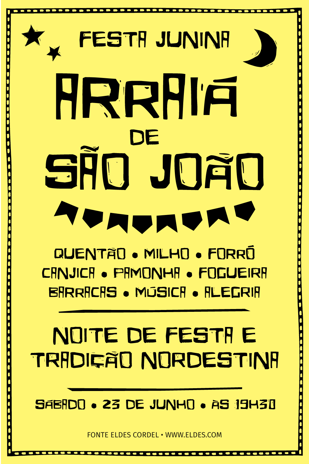 A Eldes Cordel é uma fonte inspirada na xilogravura e na literatura de cordel, trazendo o visual rústico e expressivo típico das festas juninas do Brasil.